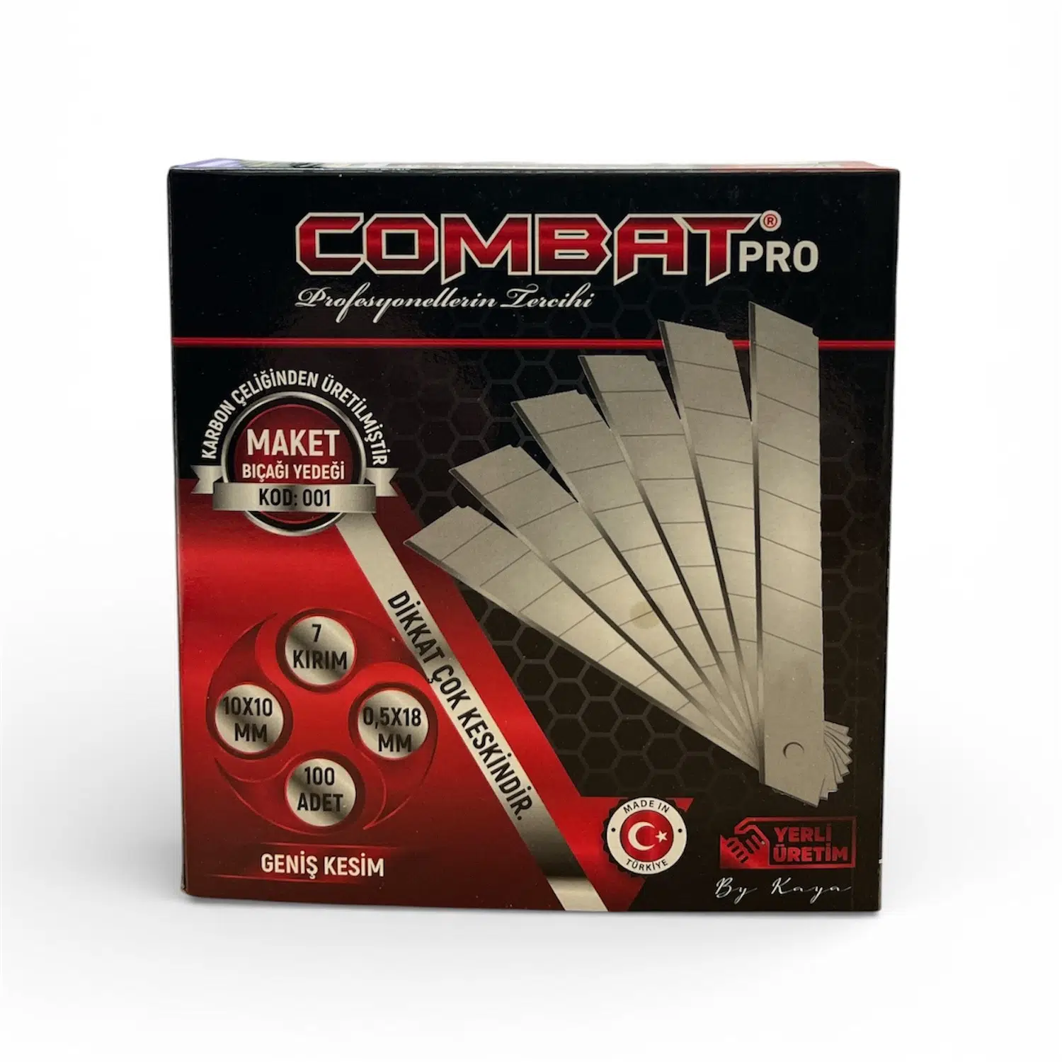 Combat Pro maket bıçağı uçları yüksek kaliteli karbon çeliğinden üretilmiştir. Bu sayede hem keskinliği uzun süre korur hem de dayanıklılığı ile profesyonel kullanım için ideal bir yapı sunar.